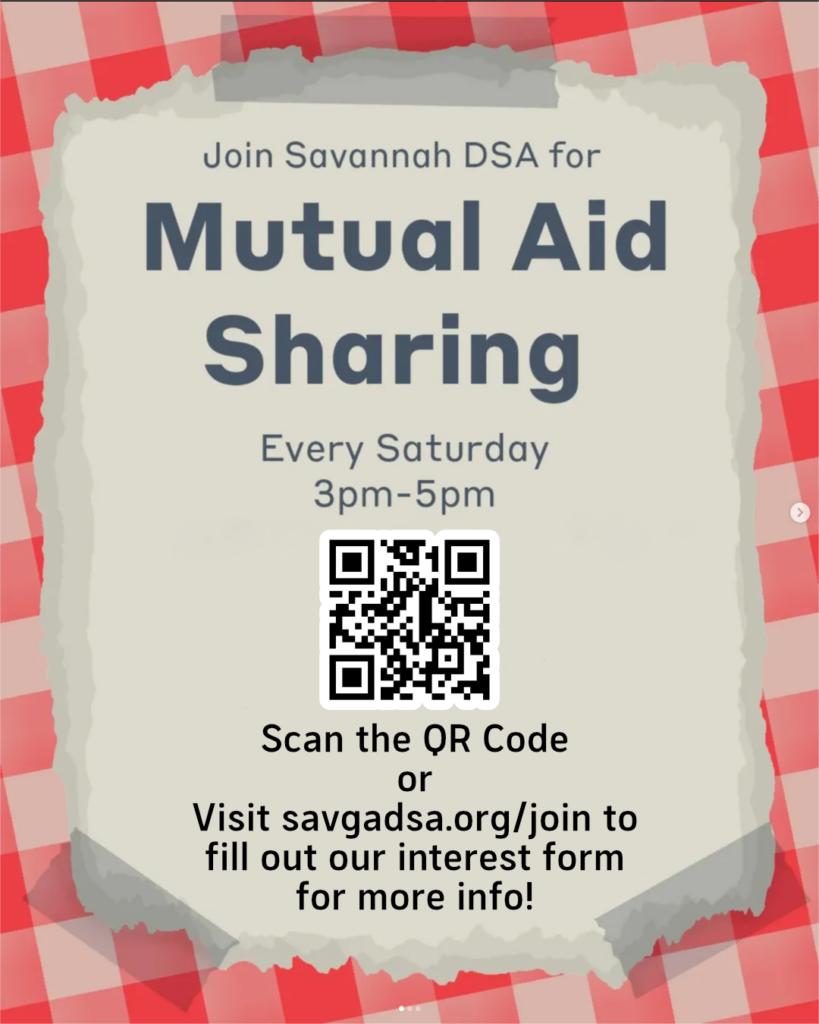 Join Savannah DSA’s Mutual Aid Working Group every Saturday from 3–5 PM.